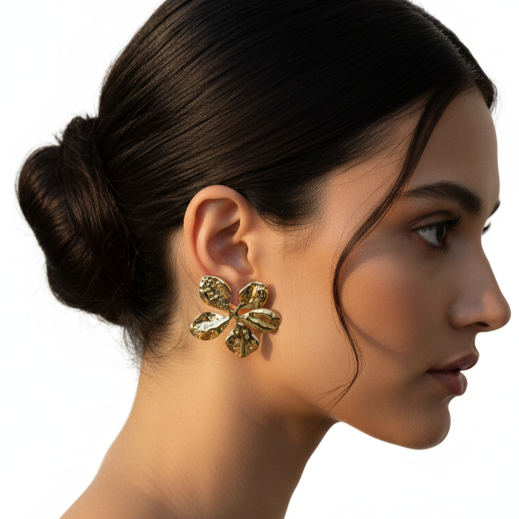 Delicate yet radiant, the Aurora Petal Gold Studs are inspired by the soft glow of morning light on blooming petals. Designed with organically shaped, textured petals in a rich gold finish, these earrings reflect light beautifully from every angle. Their floral form brings a fresh, feminine charm, while the sculpted surface adds depth and character. Perfect for daytime elegance, festive styling, or effortless everyday luxury, these studs are a graceful blend of nature-inspired design and modern sophistication.