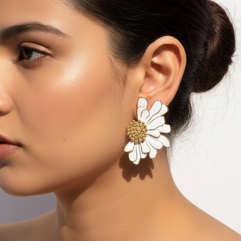 Fresh, feminine, and full of charm — our White Daisy Gold Statement Earrings are designed to brighten every look with effortless elegance. Featuring delicate white enamel petals outlined in gold with a richly textured gold center, these floral earrings create the perfect balance between softness and bold style.